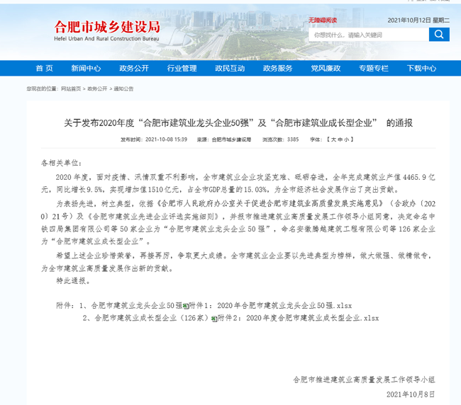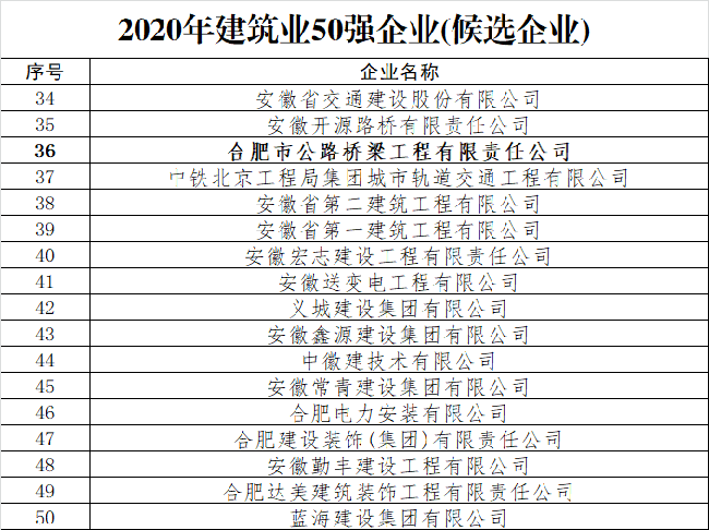 首頁 > 新聞中心 > 詳細(xì)新聞近日,合肥市城鄉(xiāng)建設(shè)局組織開展的合肥建筑業(yè)龍頭企業(yè)50強(qiáng)評選結(jié)果出爐,合肥路橋榮登合肥建筑業(yè)龍頭企業(yè)50強(qiáng)榜單。