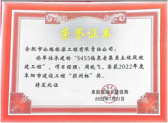 首頁 > 新聞中心 > 詳細(xì)新聞近日,合肥路橋S455臨泉老集至土坡段改建工程喜獲2022年度阜陽市建設(shè)工程“潁州杯”獎(jiǎng)。