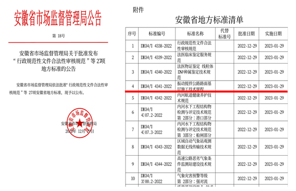 首頁 > 新聞中心 > 詳細(xì)新聞近日,安徽省市場監(jiān)督管理局發(fā)布公告,批準(zhǔn)發(fā)布27項地方標(biāo)準(zhǔn),其中包括合肥路橋主持編寫的《振動攪拌公路路面基層施工技術(shù)規(guī)程》(DB34/T 4341-2022),將于2023年1月29日正式實施。