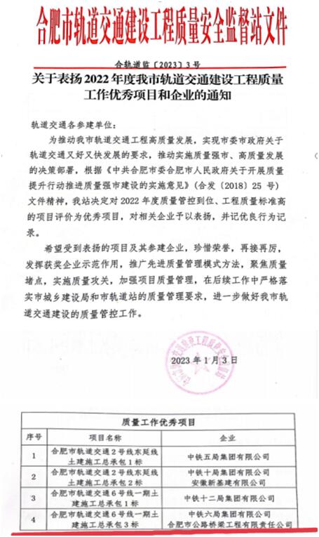 首頁 > 新聞中心 > 詳細(xì)新聞春節(jié)臨近,合肥路橋地鐵項目受到合肥市軌道交通質(zhì)監(jiān)站表彰,記優(yōu)良行為記錄。